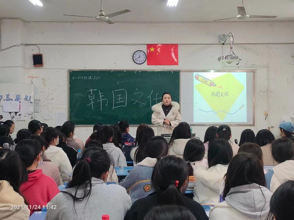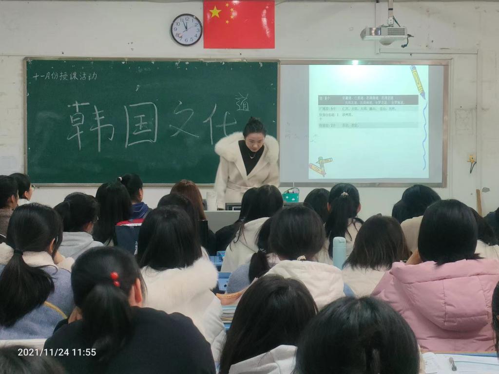 本站讯(国际教育学院 金岩 学生记者 黄依静)为增强协会成员对韩国文化的了解,丰富学生的课余生活,国际教育学院韩语协会于2021年11月24日中午11点40分在第一教学楼西504教室组织百余名学生参与由金岩老师开讲主题为“韩国文化”授课活动。