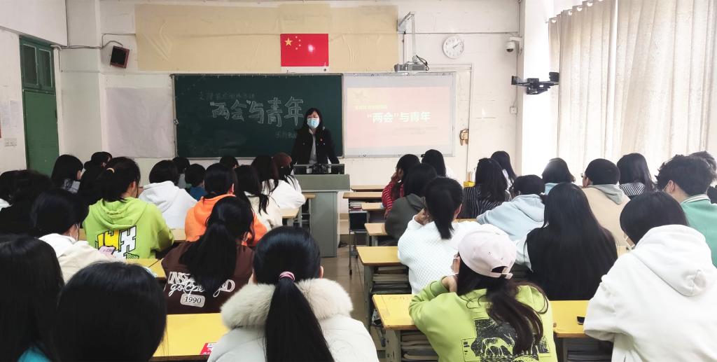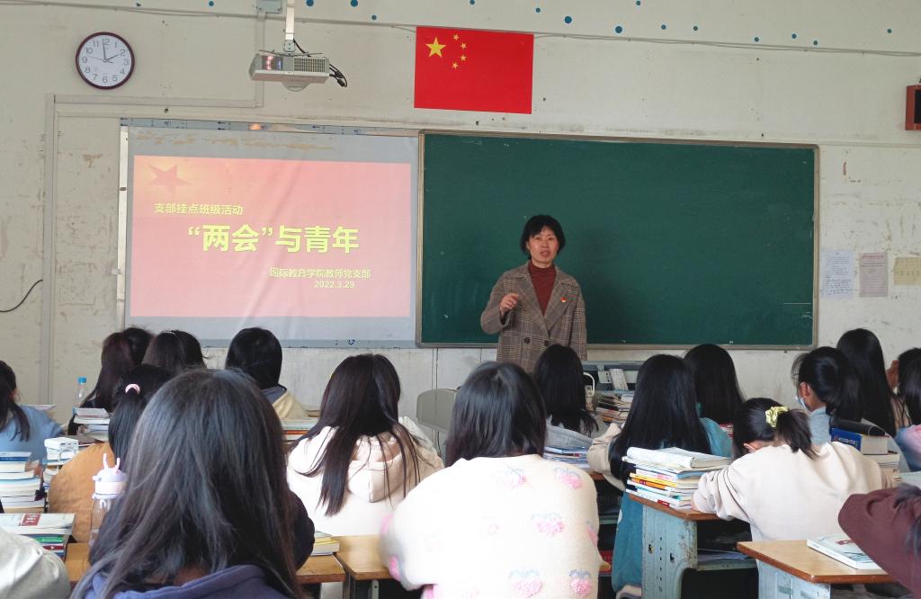 本站讯(国际教育学院 杨琨 学生记者 易琳)为学习贯彻习近平新时代中国特色社会主义思想,提高学生对“两会”精神的理解,增强学生的时代使命感和责任感,国际教育学院下属两个党支部于3月29下午2点分别在第一教学楼西402、西405教室开展主题为“‘两会’与青年”的支部挂点班级活动。本次活动以党课形式开展,由教师党支部书记周宏、学生工作党支部书记杨琨主讲,我院入党积极分子及2021级9个班级的新生代表参加。