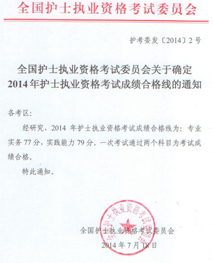 关于确定2014年护士执业资格考试成绩合格线的通知