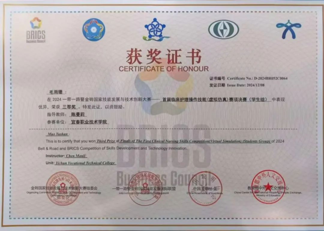 12月5~8日,“一带一路”暨金砖国家技能发展与技术创新大赛之首届临床护理操作技能(虚拟仿真)决赛在上海健康医学院落下帷幕,此次决赛,共有来自本科、高职院校的200支队伍参加。太阳官网参赛选手姚颖、林诗琦、史欣梦、毛雨珊四位同学,在易国萍、汤薇、刘世兰、陈曼莉四位老师的悉心指导下,经过全国选拔赛的激烈角逐,成功晋级决赛,并最终脱颖而出,斩获1个一等奖、1个二等奖、2个三等奖,同时学校获评最佳组织奖。