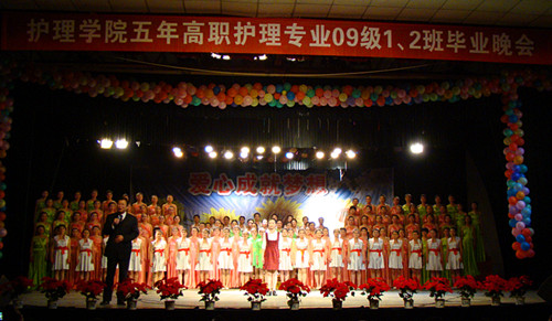 本站讯(护理学院 张晋晋 学生记者 肖红)在同学们即将离校奔赴实习之际,为感谢老师及家长的辛勤教育和悉心栽培,4月7日晚7:00,护理学院五年高职护理专业2009级1、2班在学校大礼堂举办了“爱心成就梦想”毕业晚会。校党委书记、校长刘密,党委副书记、副校长刘平,纪检书记郭健,副校长杨云山、杜贵芳,校长助理龚晓明,护理学院全体领导班子成员、教师及2009级高护1、2班同学的家长共同观看了此次晚会。