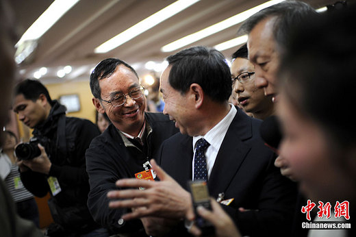 3月7日,教育部部长袁贵仁参加全国政协教育界小组讨论,听取委员意见。会后,袁贵仁受到记者围堵追访,南方科技大学校长朱清时委员为袁贵仁开道。此前,朱时清宣称要在中国打造一所“教授治校”的大学,这位前中国科技大学校长在教育部未批复的情况下,擅自拍板:自主招生、自授文凭。近日,这所大学已经迎来了它的第一批学生。中新社发 廖攀 摄
