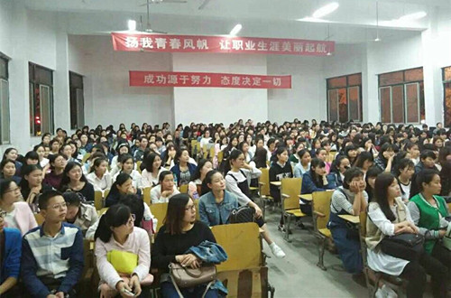 本站讯(师范学院 暨琨)4月5日晚,师范学院邀请深圳雏鹰教育投资集团有限公司董事长郭阳钰为2017届学前教育专业毕业生进行顶岗实习专题讲座。师范学院院长雷水龙、相关班主任及400余名学生参加了此次讲座。