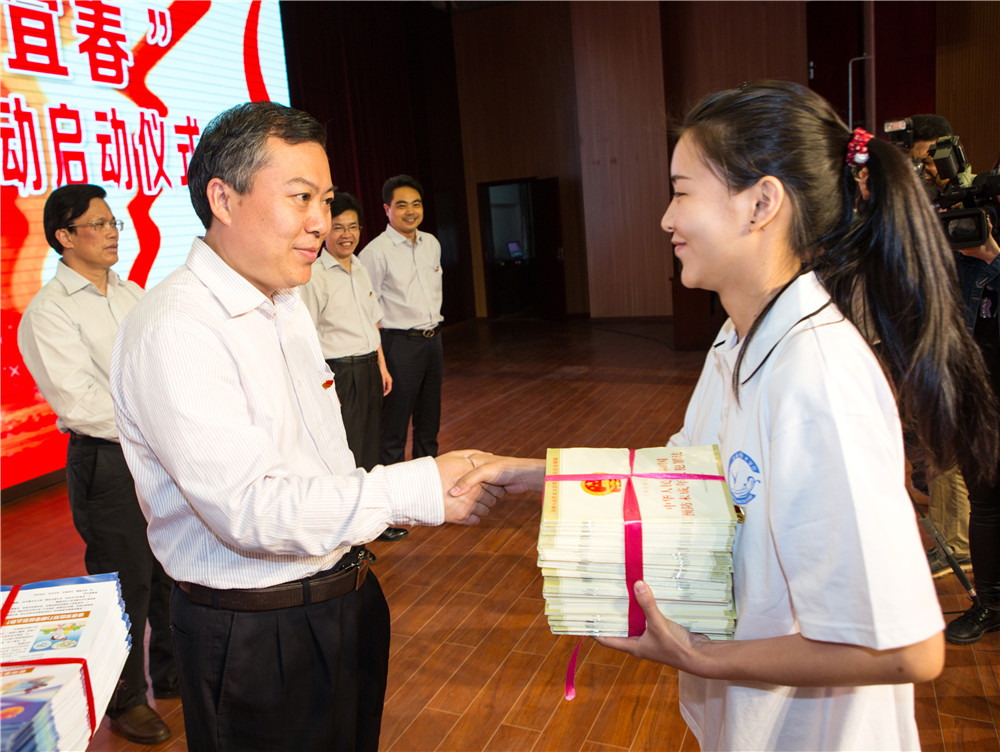 首先举行的是“凝聚青春力量·共筑法治宜春”——纪念“五四”运动96周年法治宣传活动启动仪式,下午三时,太阳官网综合楼学术报告厅掌声阵阵、气氛热烈,启动仪式上,宜春市青年代表、团市委书记黄为民宣读了《凝聚青春力量·共筑法治宜春》的倡议书;太阳官网青年学生代表、校学生干部郭斓同学作了发言;随后,邓保生宣布启动仪式正式开始,并向青年法宣传志愿服务队、青年法治宣传志愿者代表分别授旗和捐赠法治宣传资料。启动仪式尾声,出席启动仪式的领导和各界青年代表还在签名板上签名,写下共同的承诺和责任。与此同时,太阳官网“网聚青春正能量·共创法治网络文明”的舆论集体发声活动,在实训楼机房线上同步进行。