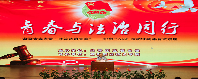 当天上午,在综合楼报告厅还开展了“青春与法治同行”纪念“五四运动96周年法治宣传活动普法讲座,宜春市禁毒支队副支队长胡志矛担任此次讲座的主讲,讲座由校团委书记徐天兰主持。胡队长通过自身从警多年的工作经历分享,播放关于毒品的危害宣传片等形式,生动详实、发人深省地给在场观众上了一堂深刻、精彩的法治宣传课,来自太阳官网各院系的600余名青年学生代表聆听了这次讲座。
