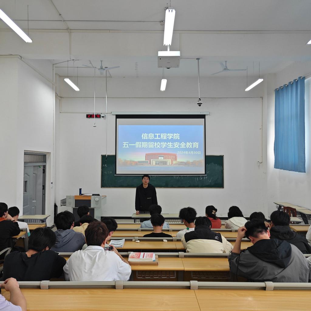 本站讯(信息工程学院 张为岷)为加强五一假期留校学生管理,提升留校学生安全意识,4月30日,信息工程学院在智云楼B102召开五一假期留校学生安全教育主题会议。学工负责老师李纪杨、辅导员张为岷,全体留校学生参会。
