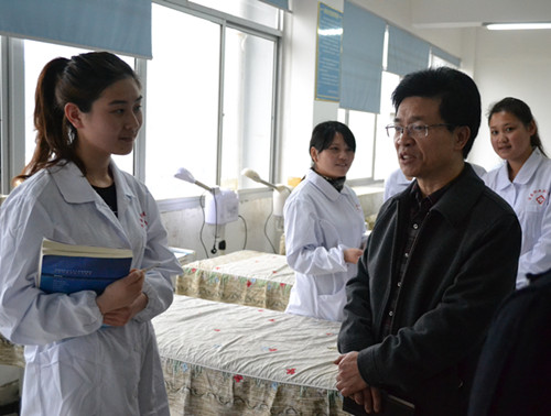 宋老师采取教学做一体化的方法进行教学,首先让学生明确学习目标和任务,明确完成项目的操作步骤,通过手法操作演示及操作练习让学生获取知识、习得技能、提高能力。杨云山认真听了宋思清老师的讲课,在课间与学生亲切交流,询问学生在校的学习生活情况。两名甘肃天水的同学表示热爱医疗美容技术专业,今年准备到上海去实习。杨云山指出,全体教师尤其是党员干部要深入课堂,与学生多交流,把党的群众路线教育实践活动深入到学生中去。